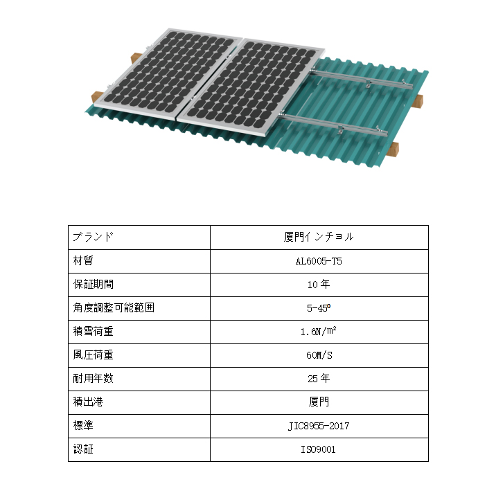 Rail roof frame with L-type metal fittings. L-shaped metal fittings are used to attach rails to metal roofs. These l feet are made of sturdy aluminum, so you can handle strong wind and snow load, and adjust the height of about 30 mm. L-shaped metal fittings are designed in consideration of corrugated metal sheet roofs. Z Since the module and the bolt are assembled in advance, it comes with a bondpad and a bondpad, and it is hard to slip after installation.